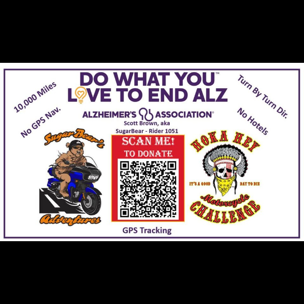 My name is Scott Brown, and in August 2026, I'm undertaking the Hoka Hey Motorcycle Challenge, a grueling endurance ride, to raise awareness and funds for the Alzheimer's Association. The Hoka Hey Motorcycle Challenge is renowned for its demanding nature of the Challenge.  Visit https://hokaheychallenge.com/ for more information. My personal mission is to honor those affected by Alzheimer's. Starting and ending in Woodstock, Illinois, on August 2nd.